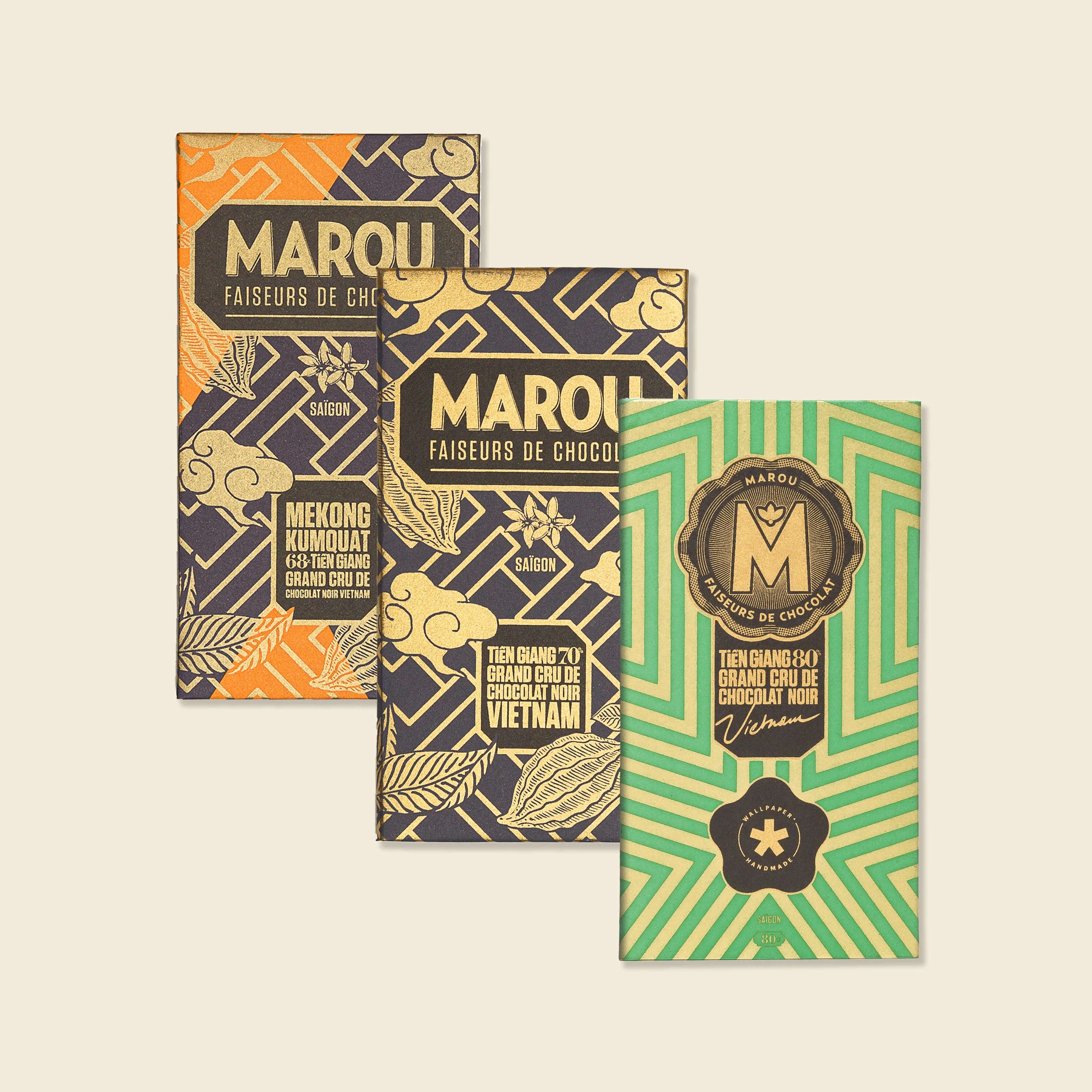 Explore the nuanced profile of Tien Giang province. This set includes the robust 80% and classic 70% dark bars, plus the innovative 68% Kumquat bar for a distinct citrus note. Ideal for experiencing a single region's flavor range.